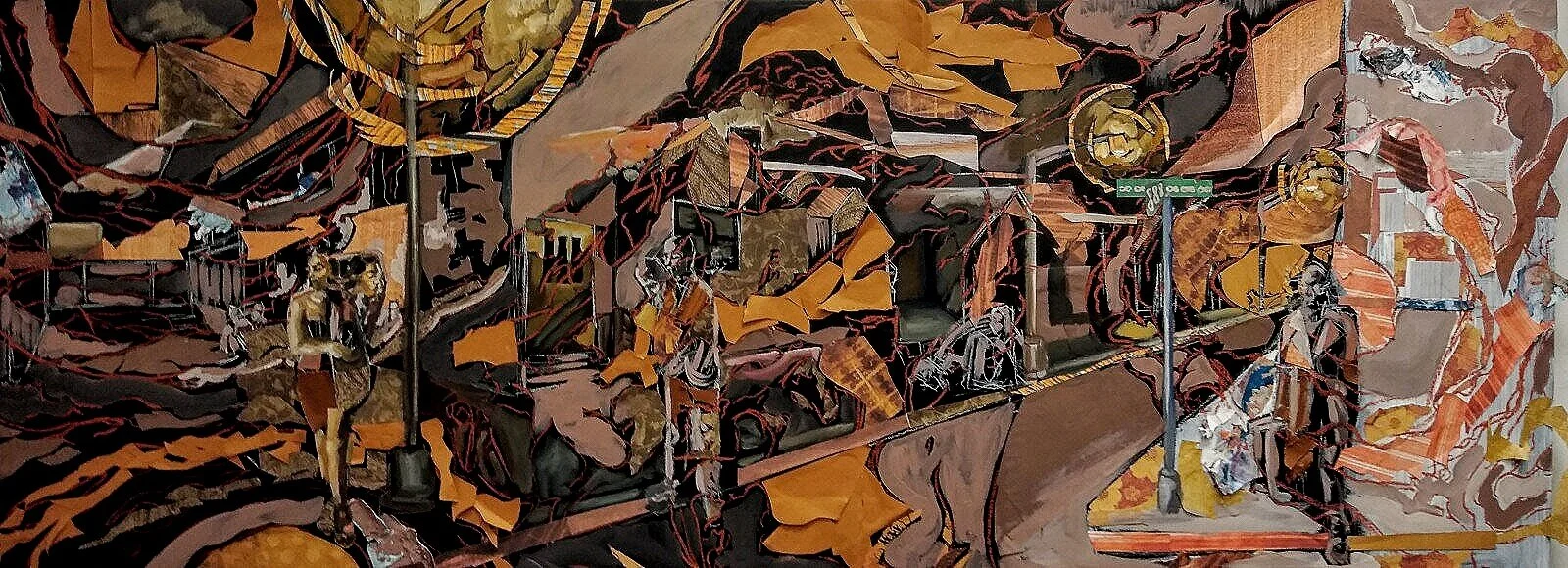 Crossing 8 Mile, Oil, Acrylic, and Collage on Wood, 3’ x 8’ feet, 2019